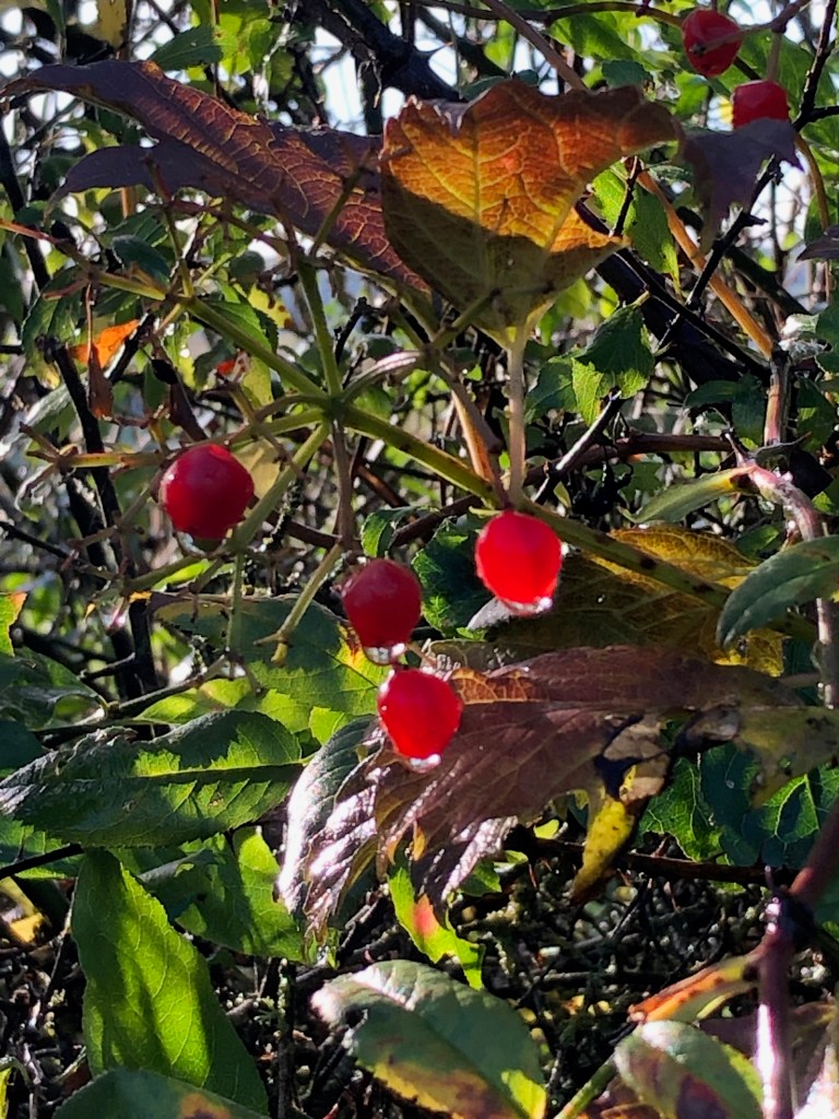 …The circle has turned all the way around the sun – (at least that is how I picture it) – since I began this blog to help me focus on colour. On late afternoons as dusk falls, the reds pop. I love to walk in the in-between times, the liminal times where you slip through the layers. Dusk and the call of blackbirds, glow of leaves, softening, darkening.. Though the wintry sun is sharp and captures the changing season’s jewels in the precious earlier daylight…
