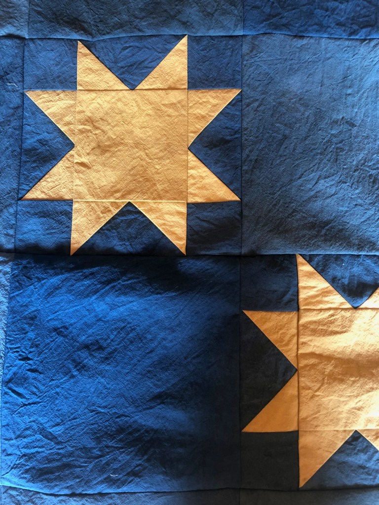 The 9 patch is pieced with colours from the kitchen, garden and field. Mixing colour from these was joyful. The onion shells carefully peeled and kept in a brown paper bag for months, then brewed for dye – it matters to me that the beginnings of hot food have another reincarnation as dye colour and then go into my compost. The simple kitchen ingredients as modifiers – such as lemon juice, vinegar or bicarbonate of soda offer endless possibilities of shades and tones which will fascinate me for my lifetime.