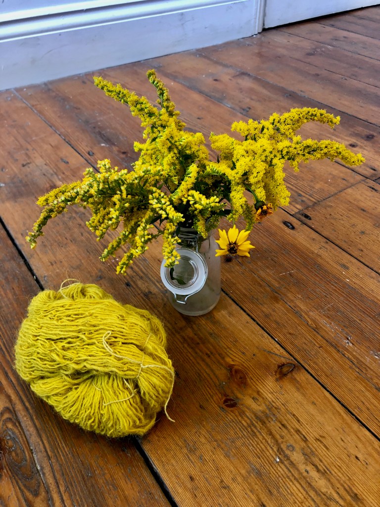 There are 3 or 4 pomegranate peels, avocado stones and skins – all kept safe and waiting. I usually work outside for dye work – for preparing, brewing and drying cloth and thread. From the garden and field there are cloth patches of colour made from dye baths of dandelion, golden rod, calendula, alder, nettle, buddleja, and more. There would have been coreopsis if the seedlings had survived a cold wet spell last year, and there will be next year as a jar sits filled with dried flowers. Sometimes I can’t bring myself to pick flowers the insects need and leave them be and just watch. People ask if the colour fades and yes, it well may or may not however careful we are. But so do we fade, become fragile, and I tend to look more closely and regularly at something that may not last and cherish it.